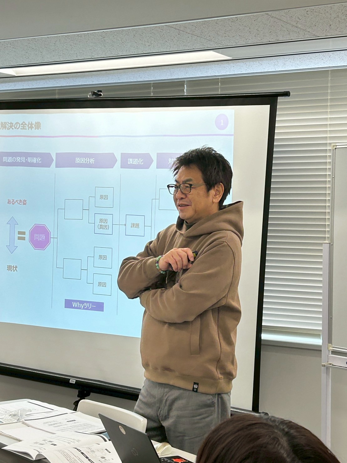 「そもそも問題とは何か?」に始まり、問題から原因の特定、課題から解決策の発見のフローを学んでいくことで、問題に対してロジカルに検討できるようにする研修です。